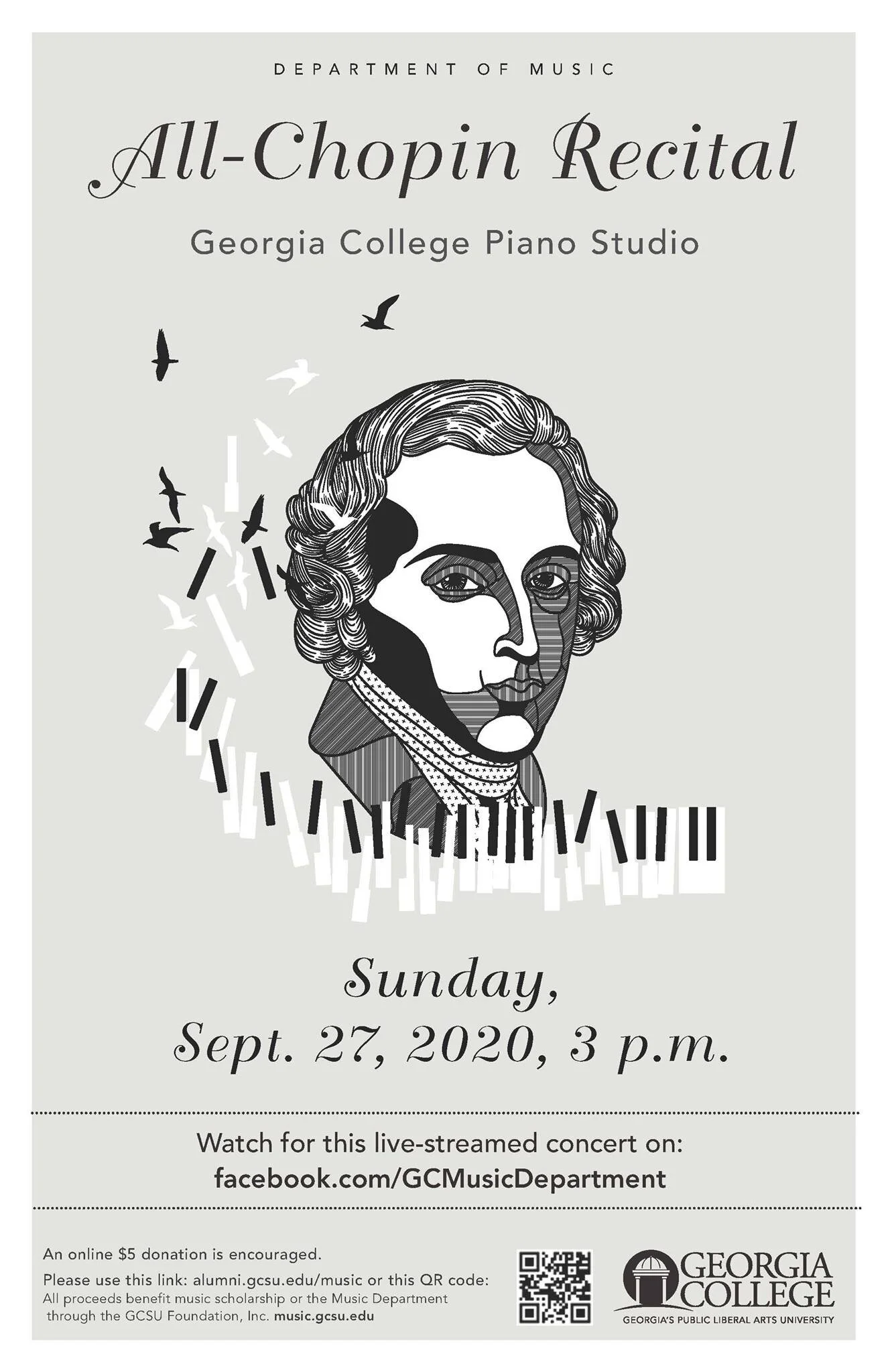 Back to All Events All-Chopin Recital // Virtual Event Sunday, September 27, 2020 3:00 PM 5:00 PM Virtual Events (map) Google Calendar ICS The GC Department of Music presents an online All-Chopin Recital, the annual week 6 studio recital of the Georgia College piano studio of Dr. Owen Lovell. This concert will only be live-streamed from facebook.com/GCMusicDepartment