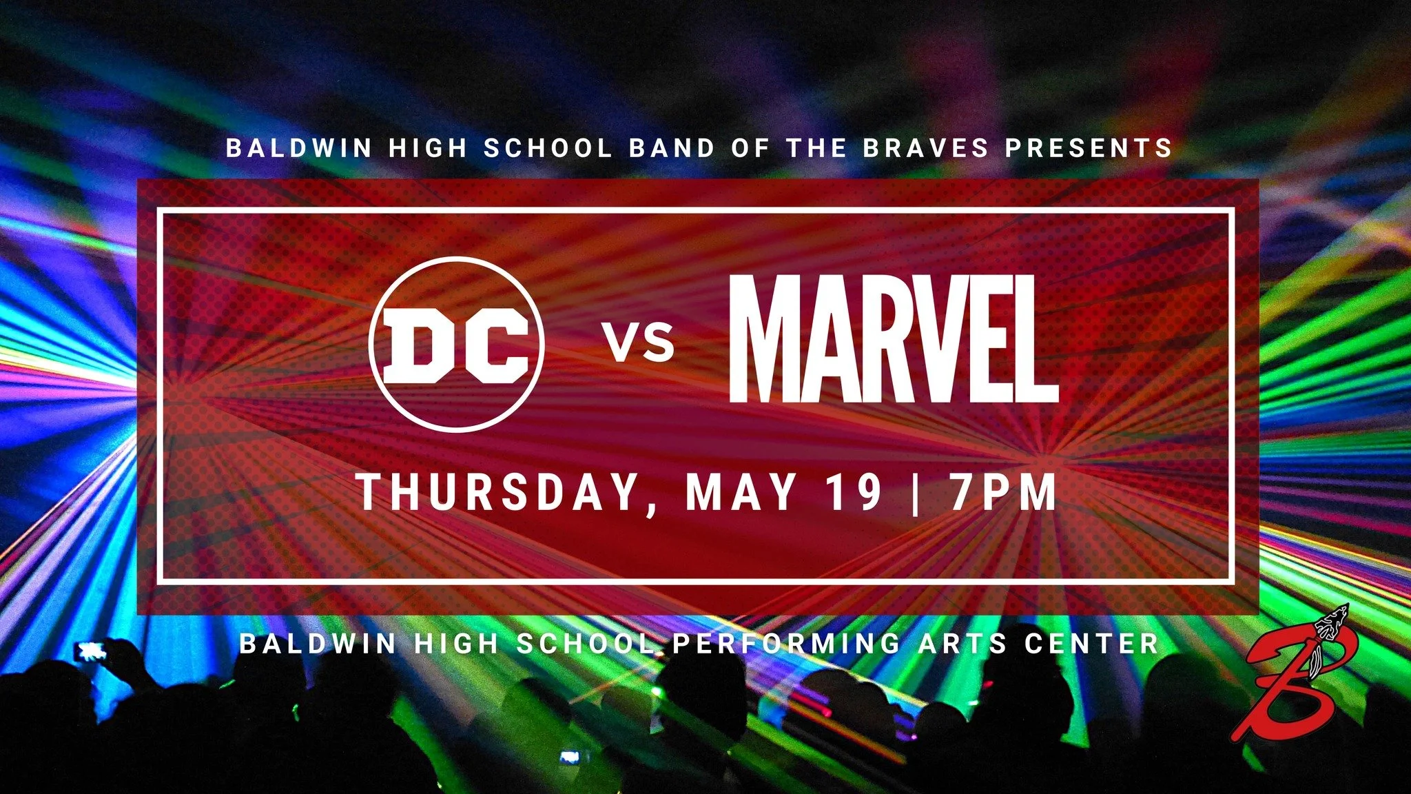 Join Baldwin High School for their spring concert on Thursday, May 19th at 7:00pm at the Baldwin High School Performing Arts Center. Students will be performing selections from the popular DC and Marvel movies. This concert will be a unique experience involving music, lights, lasers and haze. All are invited to this exciting musical experience!