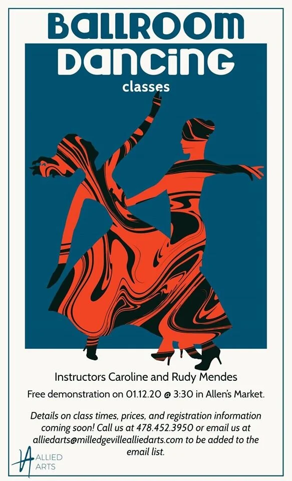 Instructors Caroline and Rudy Mendes Free demonstration on 01.26.20 @ 5:00 pm in Allen’s Market. Details on class times, prices, and registration information coming soon! Call us at 478.452.3950 or email us at alliedarts@milledgevillealliedarts.com to be added to the email list.