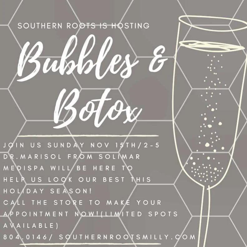 Bubbles & Botox // Southern Roots Sunday, November 15, 2020 2:00 PM 5:00 PM Southern Roots 112 South Wayne Street Milledgeville, GA, 31061 United States (map) Google Calendar ICS Ladies!! This event is for you! Dr. Marisol from Solimar Medispa will be here helping us look our best for the holiday season. Get your Christmas shopping done early this year!Appointments recommended for Botox.
