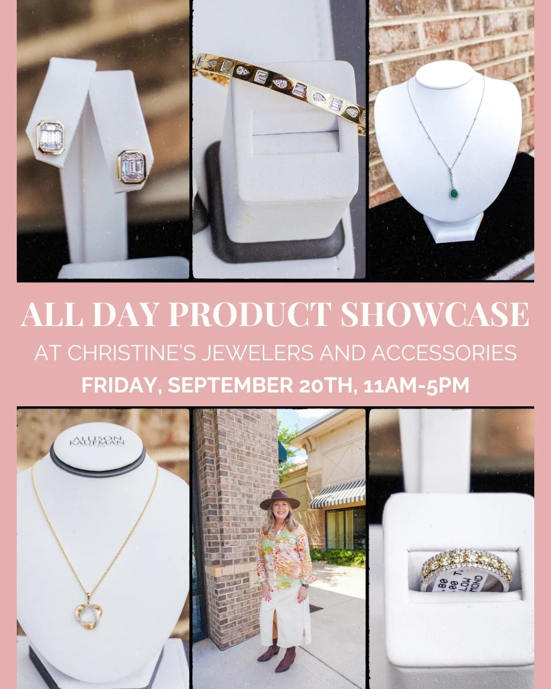 Christine's Jewelers and Accessories is hosting an all-day product showcase on September 20th from 11:00 AM to 5:00 PM. Shoppers can explore a wide selection of unique jewelry and accessories, with new arrivals and exclusive pieces on display. It's the perfect opportunity to find stunning pieces that fit any style or occasion. Don’t miss this special event for a full day of shopping and discovery!