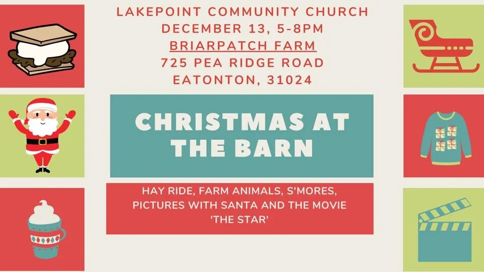 Lakepoint Community Church will host a Christmas at The Barn from 5 p.m. to 8 p.m. on Sunday at Briarpatch Farm. There will be s’mores, a hayride, farm animals and a showing of the movie “The Star.” Photos with Santa will be available until 6:30 p.m.