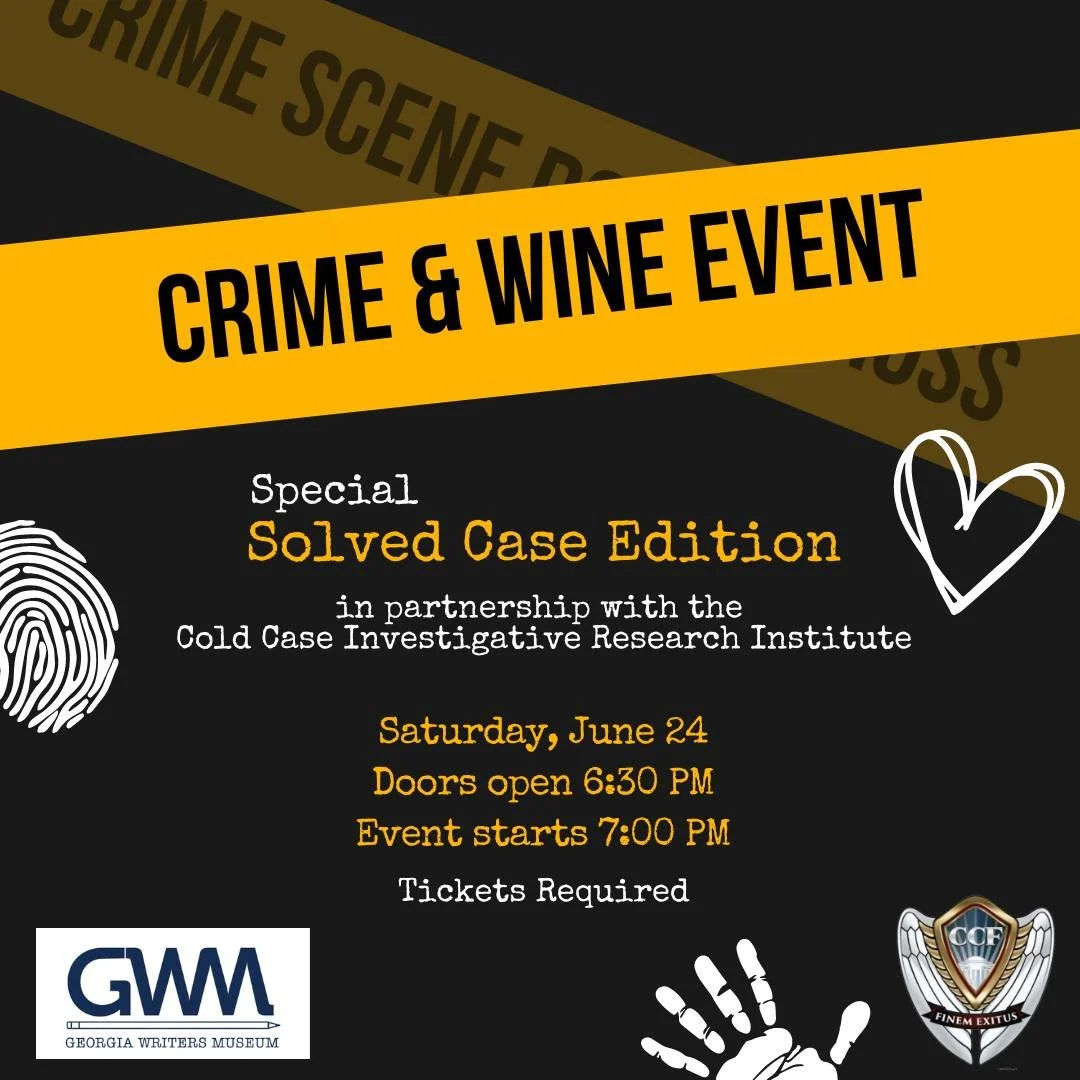 Crime & Wine Saturday, June 24, 2023 7:00 PM 8:00 PM Georgia Writers Museum 109 South Jefferson Avenue Eatonton, GA, 31024 United States (map) Google Calendar ICS Join Georgia Writers Museum for a special edition of Crime and Wine!The Special Solved Case Edition of Crime & Wine invites Chief Clay Bryant of Troup County to speak about his newest book "The Cold Case Murder of Fred Wilkerson."ticket prices: $45, single ticket$40, 2+ tickets$200, table of 6 guests Click to purchase Crime and Wine tickets