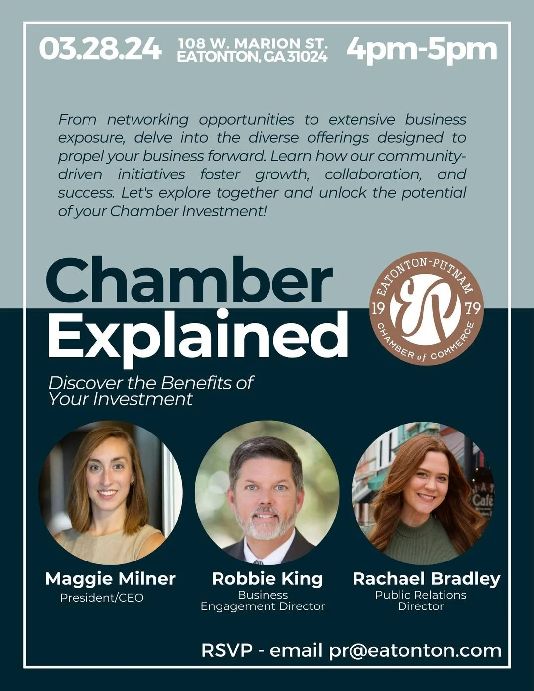 Join the Eatonton-Putnam Chamber of Commerce for their inaugural New Investor Orientation on March 28th from 4-5 pm! Meet Chamber Staff in person and discover all the benefits of becoming an investor with the Eatonton-Putnam Chamber of Commerce. Don't miss this chance to maximize your membership!