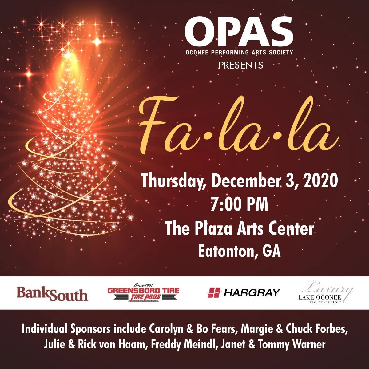 Fa-la-la // The Plaza Arts Center Thursday, December 3, 2020 7:00 PM 10:00 PM The Plaza Arts Center 305 North Madison Avenue Eatonton, GA, 31024 United States (map) Google Calendar ICS Fa-la-la holiday concert with all the trimmings: Song, Santa, and so much more! A great way to start the holiday season. Enjoy it in the beautiful Plaza theater.