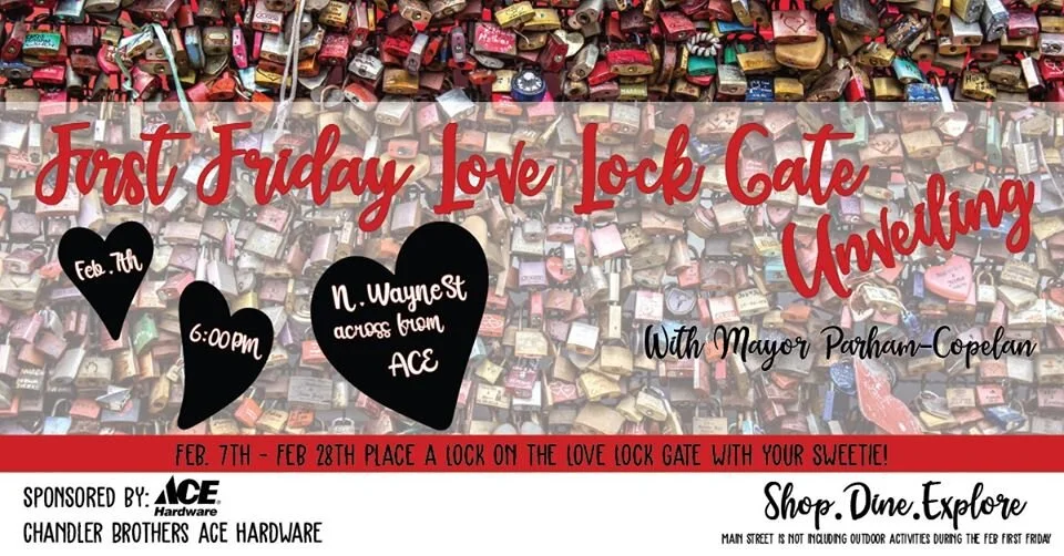 Join us on February 7th at 6:00pm for the First Friday Love Lock Unveiling sponsored by Chandler Brothers ACE Hardware! Add a love lock to the fence to symbolize your love, friendship, or admiration between Feb 7th- Feb 28th. The gate will be located on North Wayne Street across the street from Chandler Brothers ACE Hardware (near Kirk's Jerk Kitchen).