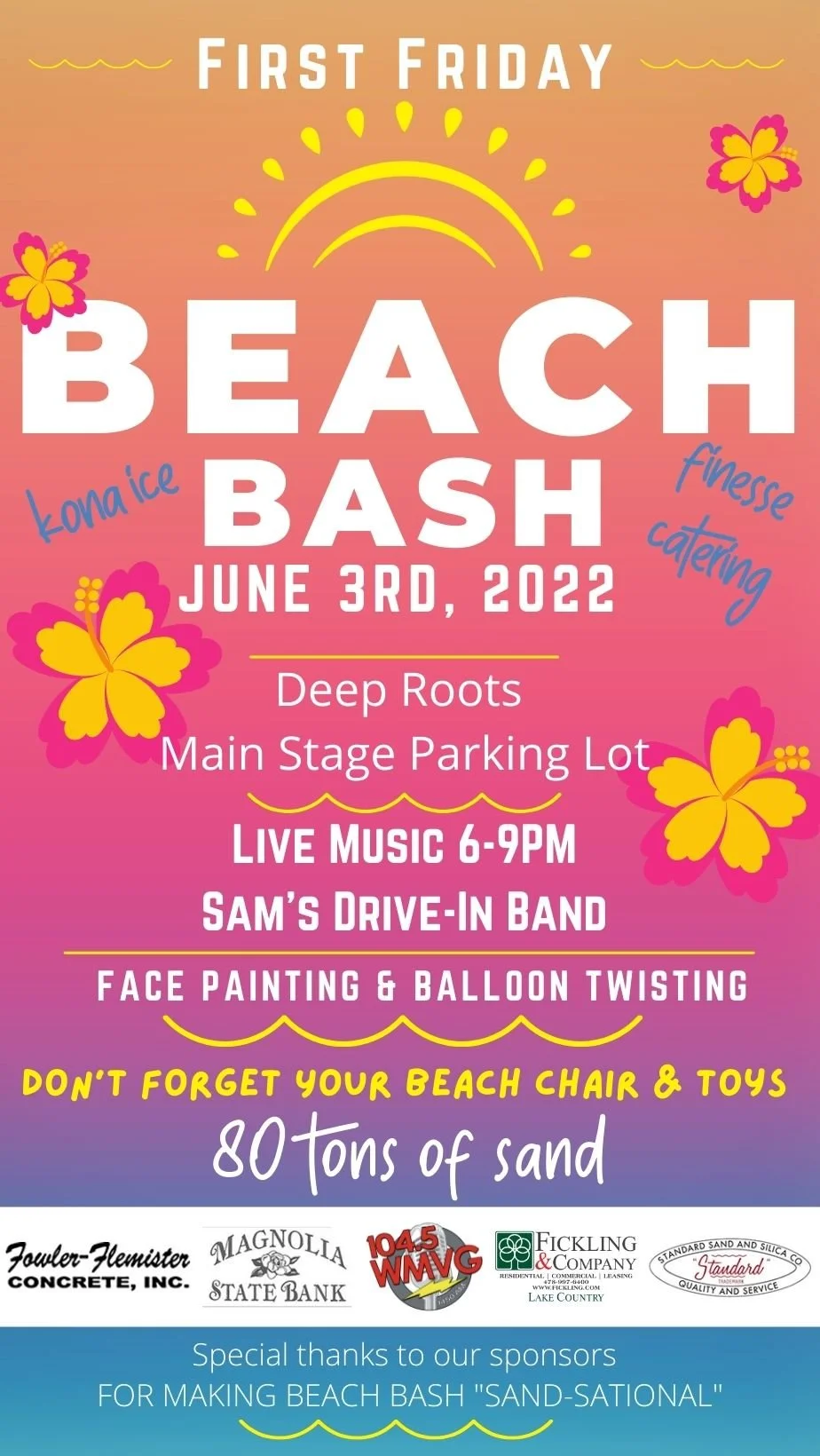 The First Friday in June is going to be a blast with the 2022 Beach Bash! There will be 80 tons of beach sand spread out and ready for the kids to play in along with toys, mini pools and plenty of entertainment for the entire family. The adults can dance the night away to the beach tunes that everyone knows and loves thanks to Sam's Drive-in Band. Kona Ice and FInesse Catering will be back for all the snacks and the balloon twister and face painter will be working their magic as well. Special thanks to Standard Sand and Silica, and also Fowler- Flemister Concrete, Inc. for the donation and delivery of all the sand for the event. This event is graciously sponsored by our Champion Sponsors, Fickling Lake Country, LLC, Magnolia State Bank, and WMVG 104.5. Everyone is encouraged to grab a meal and drink from one of the over 12 downtown restaurants, then have a blast and enjoy the live music!