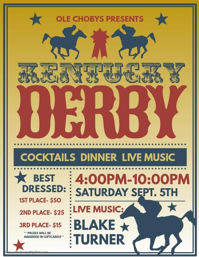 Ole’ Chobys is having a Kentucky Derby Cocktail Dinner! This Saturday, Sept 5th, we will have live music preformed by singer/songwriter, Blake Turner. We will be offering “derby” cocktails and specialty entrees. Also, a best dressed contest! Wear your best Kentucky Derby outfit & win prizes!! A great way to spend a Saturday evening on Lake Sinclair.
