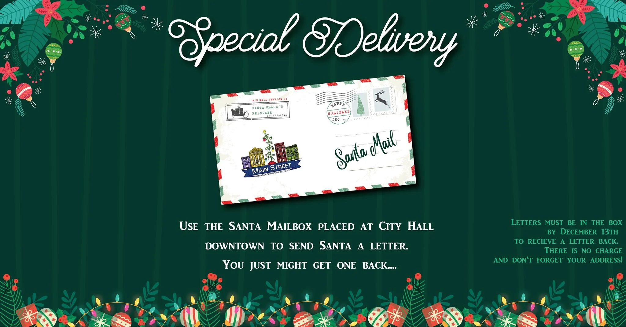 The special Santa Mailbox will be located outside of City Hall from November 20th until December 13th. Children are encouraged to drop off letters to Santa in the special Santa Mailbox and make sure the address is legible because Santa just might mail a letter back. There is no charge to send Santa a letter.