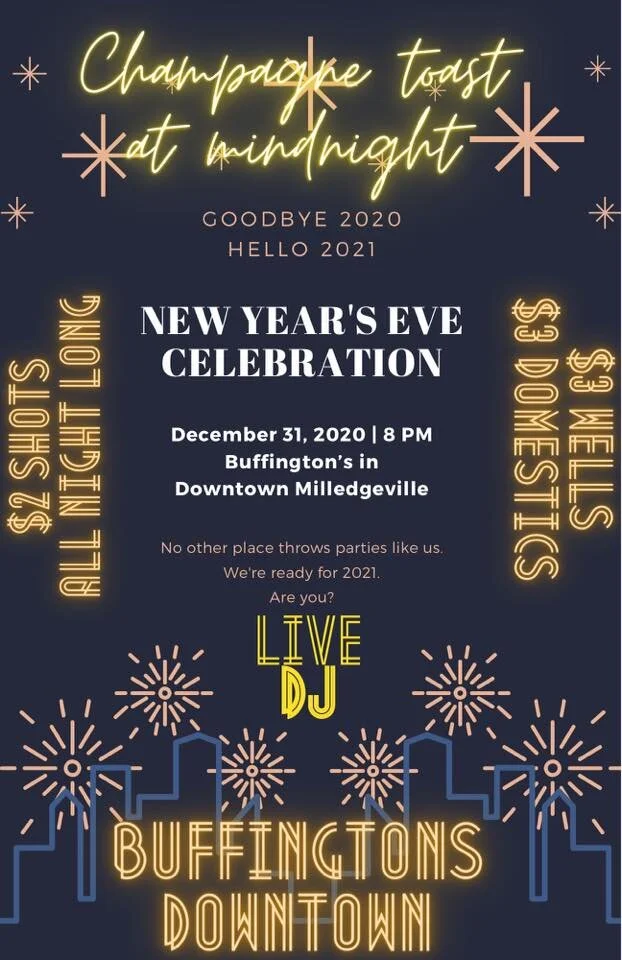 New Year's Eve Celebration at Buffington's Thursday, December 31, 2020 8:00 PM Friday, January 1, 2021 2:00 AM Buffington's 120 West Hancock Street Milledgeville, GA, 31061 United States (map) Google Calendar ICS Buffington’s in Downtown Milledgeville will be ringing in the New Year with a live DJ and champagne toast at midnight. There will be $2 shots, $3 wells and $3 domestics available. The celebration begins at 8 p.m. on New Year’s Eve.