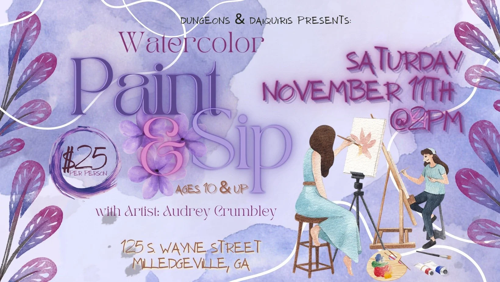 Get ready for an unique and exciting experience at Dungeons And Daiquiris' paint & sip event! For an entry fee, you'll not only receive a refreshing drink but also have the opportunity to learn from the talented local artist, Audrey Crumbley.