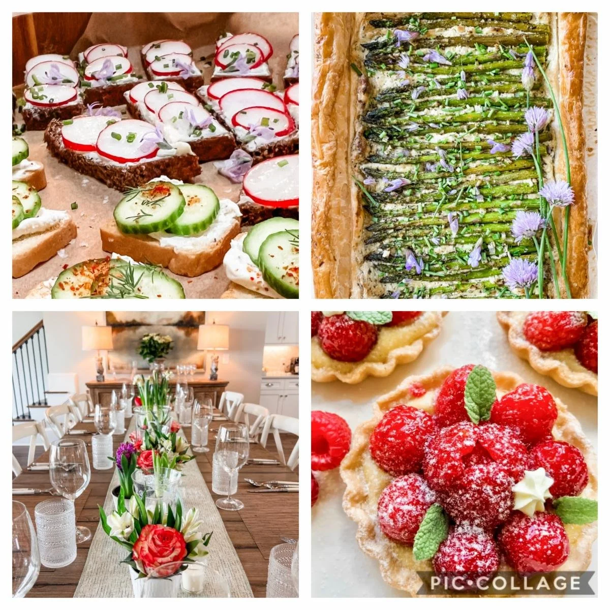 ~Radish Canapés with salted butter on Pumpernickel ~Asparagus Tart with Cheese & Prosciutto, served with a Zucchini, Cucumber Salad ~Individual Fresh Fruit Tarts, made easy!