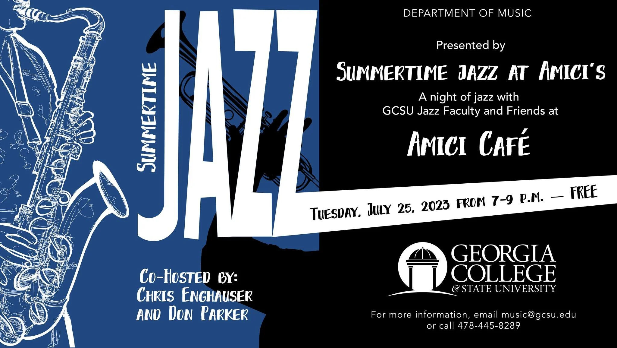 Back to All Events Summertime Jazz // Amici Milledgeville Tuesday, July 25, 2023 7:00 PM 9:00 PM Amici Milledgeville 101 West Hancock Street Milledgeville, GA, 31061 United States (map) Google Calendar ICS Come out and enjoy A Night of Jazz with GCSU Jazz Faculty and Friends Tuesday, July 25, 7-9 pm at Amici in downtown Milledgeville! Hosted by Chris Enghauser and Don Parker. Come in from the heat and enjoy the menu and the live Jazz at Amici!