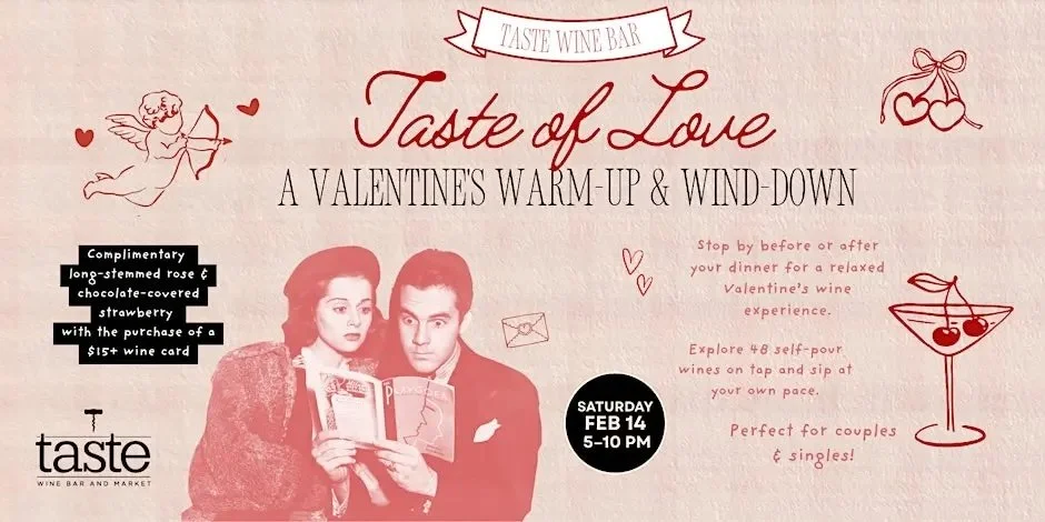 Taste Wine Bar invites guests to stop by before or after Valentine’s dinner for Taste of Love, a casual, wine-forward experience designed for effortless celebrating. Perfect for couples, singles, or friends, this come-and-go event offers a cozy, romantic atmosphere with no reservations and no pressure — just great wine and good vibes.
