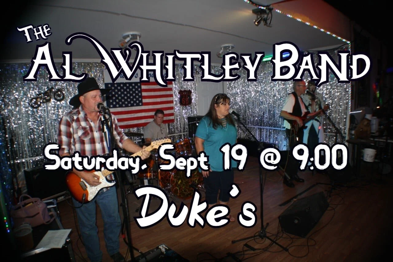 Back to All Events The Al Whitley Band // Dukes Lounge & Dawg House Saturday, September 19, 2020 9:00 PM Sunday, September 20, 2020 1:00 AM Dukes Lounge & Dawghouse 162 Sinclair Marina Road Northeast Milledgeville, GA, 31061 United States (map) Google Calendar ICS Join in for a great night with all your friends at Duke's. $8.00 cover @ the door. Al and Mandy will perform many of your favorite tunes, The awesome bartenders will serve your favorite beverage.