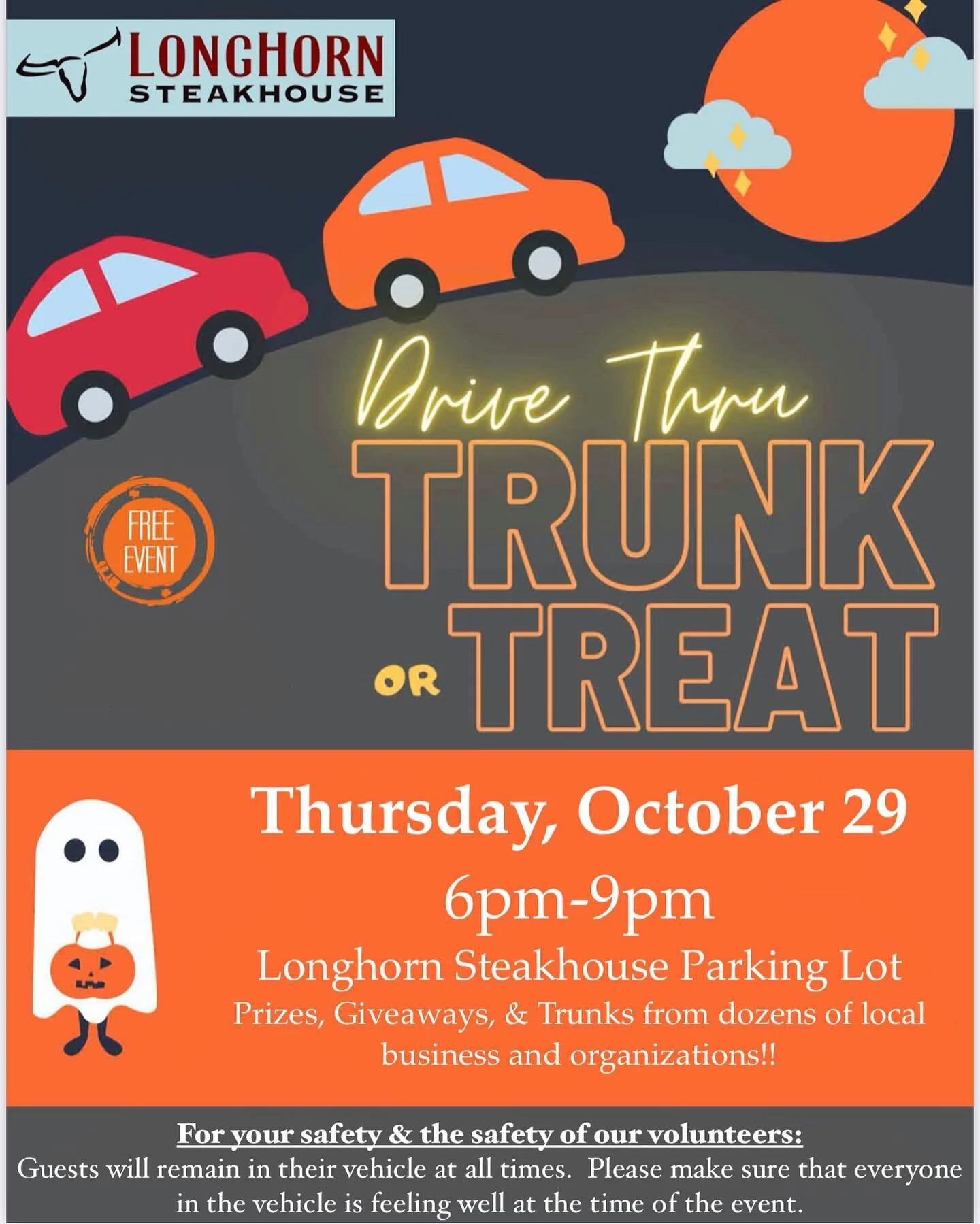 Trunk or Treat // Longhorn Steakhouse Thursday, October 29, 2020 6:00 PM 9:00 PM Longhorn Steakhouse 2470 North Columbia Street Milledgeville, GA, 31061 United States (map) Google Calendar ICS Start Halloween on Thursday at Longhorn Steakhouse. For the safety of our guests and volunteers this year's Trunk or Treat will be done 'Drive-Thru' style! A fun time for the kids.