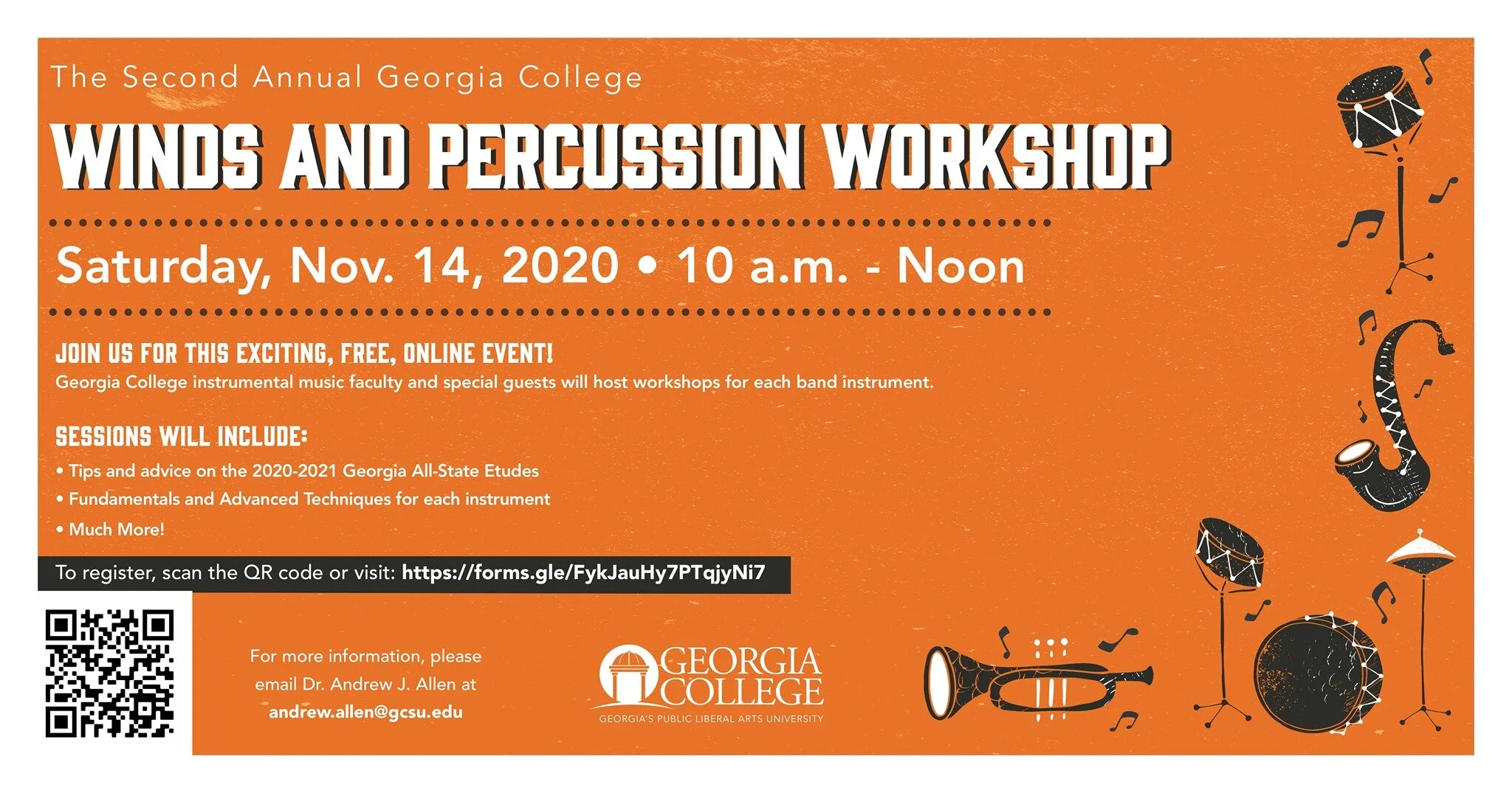 Georgia College Winds and Percussion Workshop: Join us for this exciting, free, online event! Georgia College instrumental music faculty and special guests will host workshops for each band instrument. For more information, please email Dr. Andrew J. Allen at andrew.allen@gcsu.edu